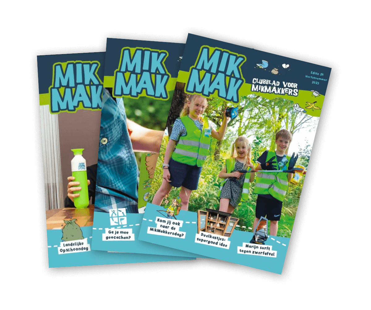 MikMakkers gaan voor een schone wereld! En daar hoort een goede uitrusting bij. Daarom krijgen MikMakkers een cool starterspakket met opruimmaterialen, zoals een afvalknijper, emmer en veiligheidshesje. Ook ontvangen ze vier keer per jaar een clubblad. Hierin lezen (en leren) ze van alles over zwerfafval, maar ook over afval in het algemeen, recycling en hergebruik.